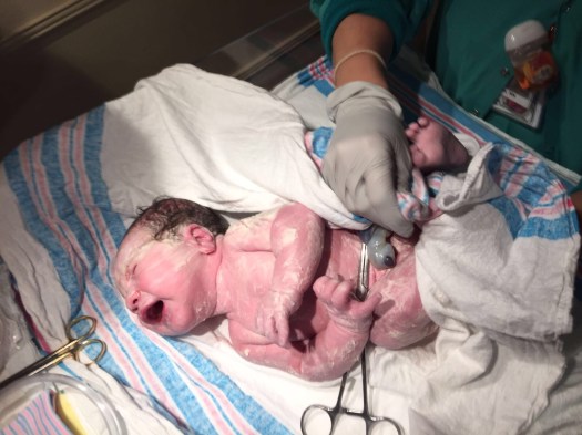 By 9:25 pm they “broke the bed”. Its all blurry from here, but between pushes, there was talk about seeing the baby’s head and about how he was strong since his heart rate would go up and not down when I would push. There were also comments about me being a “good pusher” for a FTM… all the while I was nauseated begging for those green barf bags across the room! My dad held my left leg, my mom cheered me on from directly in my sight line and hubby held my right leg. I thought (and everyone expected) I would scream and curse and lose my cool, but I only threw an F-bomb or two under my breath and told the Dr I’ couldnt do this anymore, to which he replied “Yes, you can.. you’re doing awesome” (He mentioned the baby had a big head and that was the difficulty) I was given an oxygen mask and cold wet rags. My dad was so into the delivery and baby’s head that he kept blinding me with the rags and pinching my nose shut with the oxygen mask, HA! He was somehow doing great and killing me all at the same time!